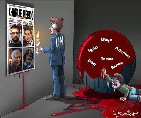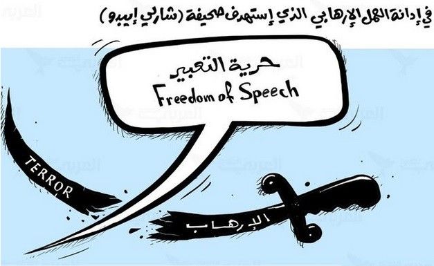 Karikaturistët arabë po reagojnë ndaj revistës franceze “Charlie Hebdo”, duke vënë në pikëpyetje kuptimin e lirisë së fjalës në Perëndim dhe duke sulmuar liderët e tyre hipokritë si dhe Izraelin për aplikimin e dy standardeve ndaj myslimanëve.
