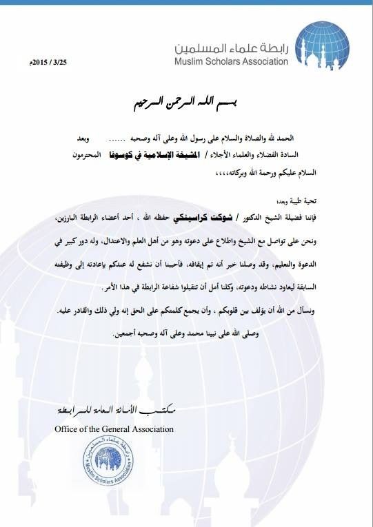 “Ju njoftojmë juve se i nderuari Dr. Shefqet Krasniqi është një anëtar i dalluar i Ligës së Dijetarëve Musliman, e ne kemi raporte të mira me të, e njohim atë për së afërmi. Ai është një dijetar i njohur për thirrje në Islam. Ai luan një rol të rëndësishëm në fushën e edukimit dhe vetëdijesimit në shoqërinë ku jeton. Së fundmi kemi kuptuar se i nderuari Dr. Shefqet Krasniqi është larguar nga xhamia si imam, andaj kërkojmë nga Bashkësia Islame që ta rikthen atë atje ku ka qenë në mënyrë që ta vazhdoj kontributin e tij. Shpresojmë nga kryesia e BIK-ut që kjo kërkesë e jona të hasë në mirëkuptim. Ashtu siç e lusim Zotin që t'ua afroj zemrat mes hoxhollarëve në rrugën e vërtetë, shkruan në kërkesën e zyrë së përgjithshme të Ligës së Dijetarëve Mysliman.